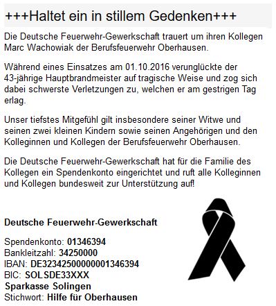 Die Deutsche Feuerwehr-Gewerkschaft hat ein Spendenkonto eingerichtet, um die Angehörigen in dieser schweren Zeit zu unterstützen: